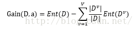 假定离散属性a有V个可能的取值{a1,a2,...,aV},如果使用属性a对样本集D进行分类的话,会产生V个分支节点,其中,第v个分支节点包含了D中所有在属性a上取值为av的样本子集,即Dv,该子集所占样本集的比例为|Dv|/|D|。所以,用属性a对样本集D划分所获得的信息增益(information gain)定义为: