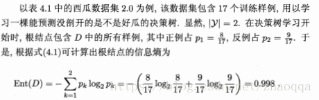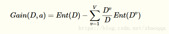 假定离散属性a有v个可能的取值(a1,a2,a3,...av),若使用a来对样本集进行划分,则会产生v个分支节点。其中第V个分支节点包含了样本集合D中在属性a上取值为av的样本Dv.我们可以根据信息熵的公式计算信息熵考虑到不同分支节点包含的样本数不同,样本数越多的分支节点权重越大,给分支节点赋予权重