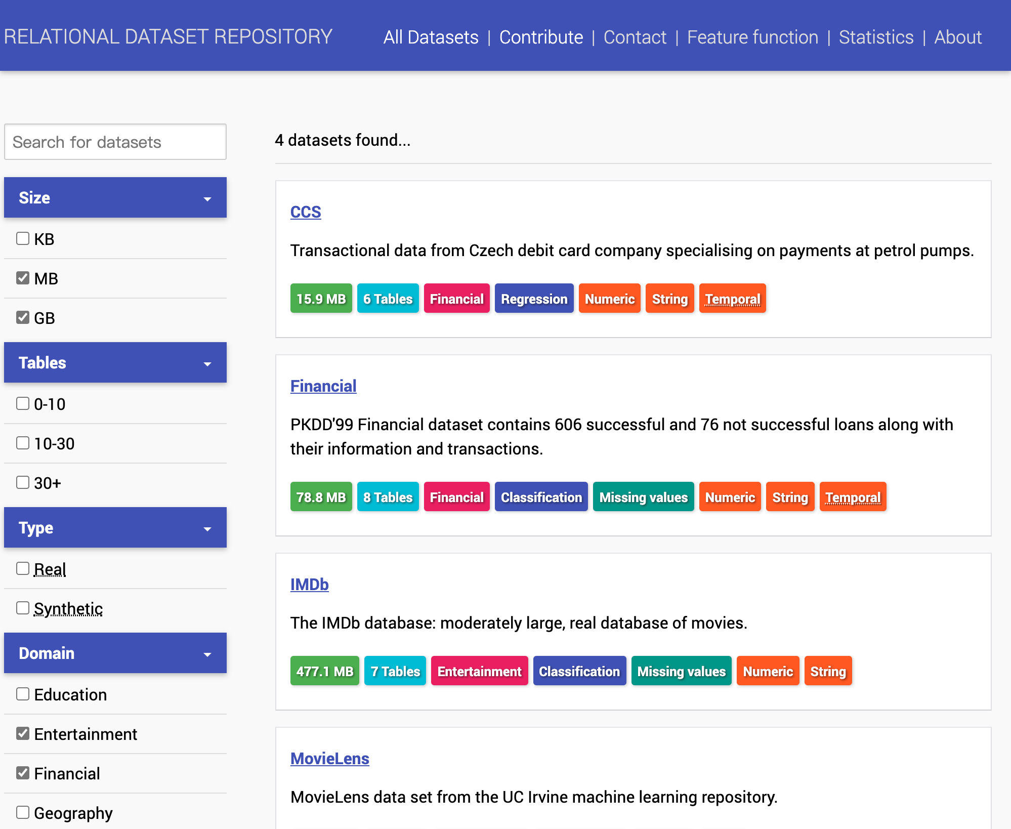 关系机器学习的数据集集合。能够以数据集大小、领域、数据类型等条件来检索数据集。