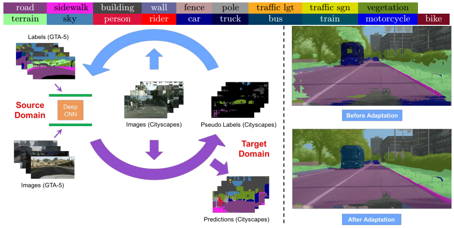 在本文中,我们提出了一种基于迭代自训练(self-training)过程的新型UDA框架.该问题被形式化为潜在变量损失最小化,并且可以通过生成目标数据的伪标签和通着这些伪标签再训练来解决这些问题。在ST之上,我们还提出了一种新颖的类平衡自训练(CBST)框架,以避免大类在伪标签生成上的逐渐优势,并引入空间先验来细化生成的标签。综合实验表明,所提出的方法在多个主要UDA设置下实现了最先进的语义分割性能。