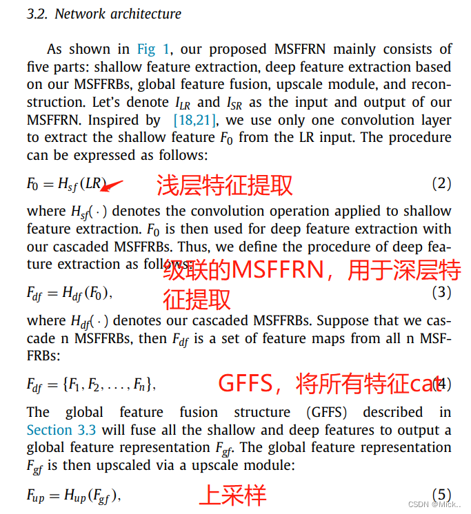 摘要:大多数SR方法没有利用LR的多尺度特征去提升网络的表示能力。此外,他们也并没有利用网络间的层次特征。作者提出了一种多尺度特征融合残差网络(MSFFRN)。作者基于残差学习,提出了多尺度特征融合残差块(MSFFRB)去检测和融合不同尺度的特征。此外,MSFFRB和浅层特征被用作不同层次的特征用于全局特征融合。最后,作者基于融合的全局特征重建HR图像。