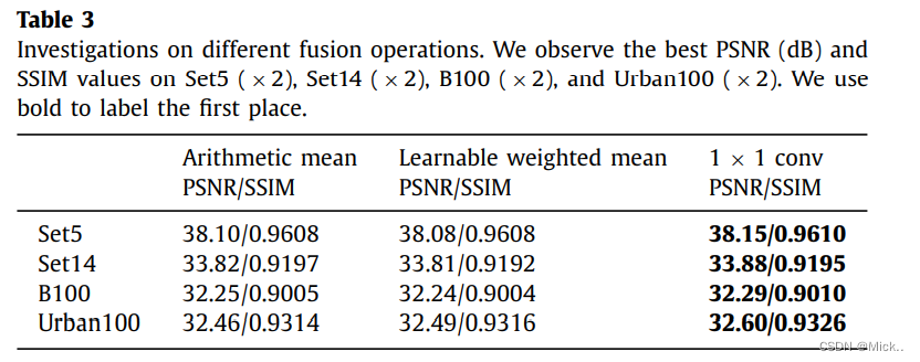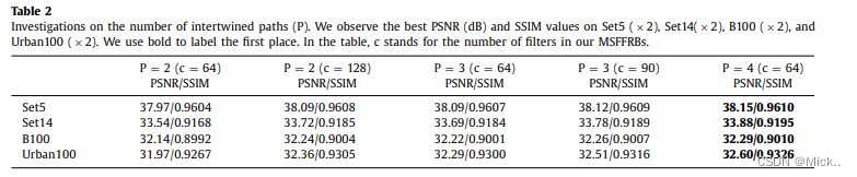 设置MSFFRB D=10.在每个MSFFRB中,设置交叉路径的个数P=4.作者设置所有的卷积层大小为3*3,除了融合操作大小设置为1*1.卷积层核大小为3*3,零填充(保持输出特征图的大小不小)。在浅层特征提取阶段所有卷积层的个数 C=64 。上采样模块,和EDSR一样。最后的卷积层有三个滤波器,因为输出有三个通道。