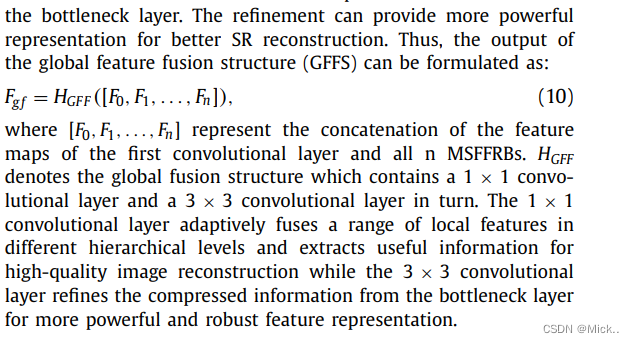 首先,concat MSFFRBs和浅层特征的输出,然后引入1*1卷积作为Bottleneck去自适应的提取有用信息。最后使用一个3*3的卷积核去提炼压缩信息。提炼这一步提供了更加有用的表示。