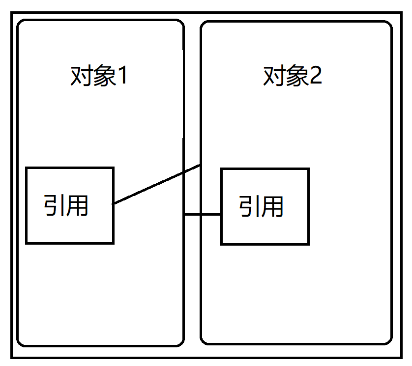 在上图中,对象1和对象2在外界没有被引用,按道理来说他俩是垃圾对象,应该被回收,但是这两个对象中各有一个指向对方的引用,这就导致对方的引用计数器不为0,jvm在检测垃圾的时候无法把他俩判定为可以回收的垃圾,也就没有办法回收他俩占用的内存区域,因此造成了内存泄漏。为了解决这个问题,就诞生了第二中回收策略。