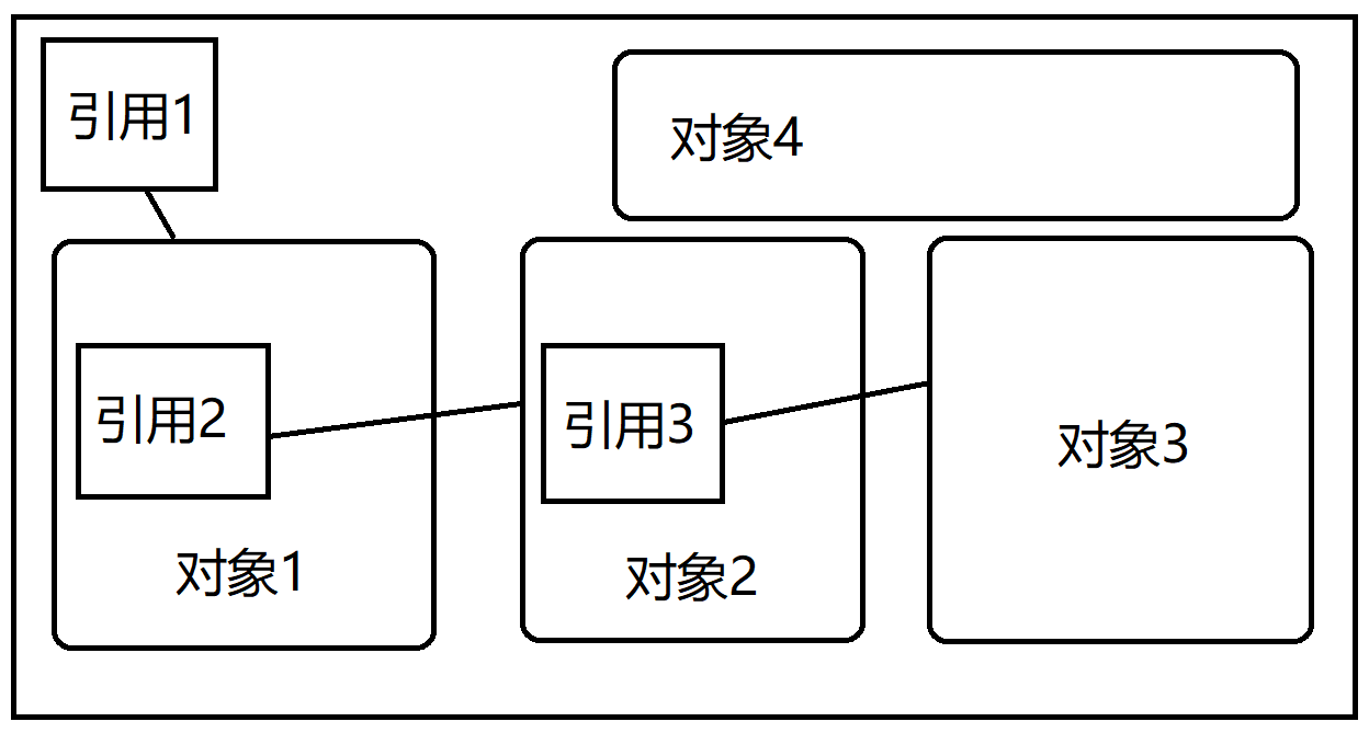 在上图中,把引用作为GC root向下遍历,可以顺着GC链(每一个连接两个对象的引用链)找到对象1,对象2,对象3并给这些对象做一个标记。jvm通过标记判断认为对象1,对象2和对象3都是有用的对象,但是对象4因为没有被做标记,jvm就认为它是个无用的对象,就会回收它。