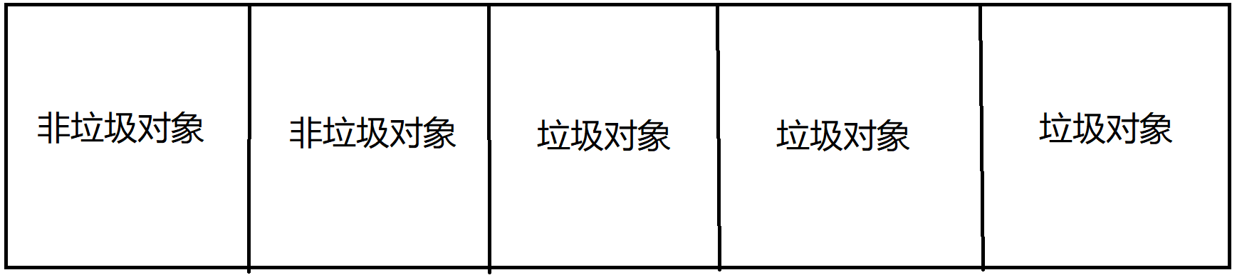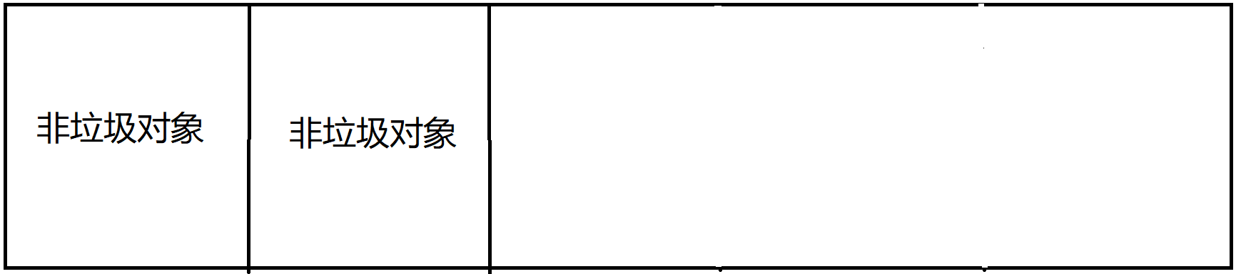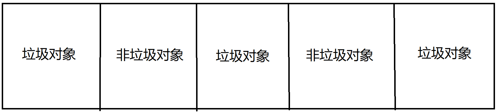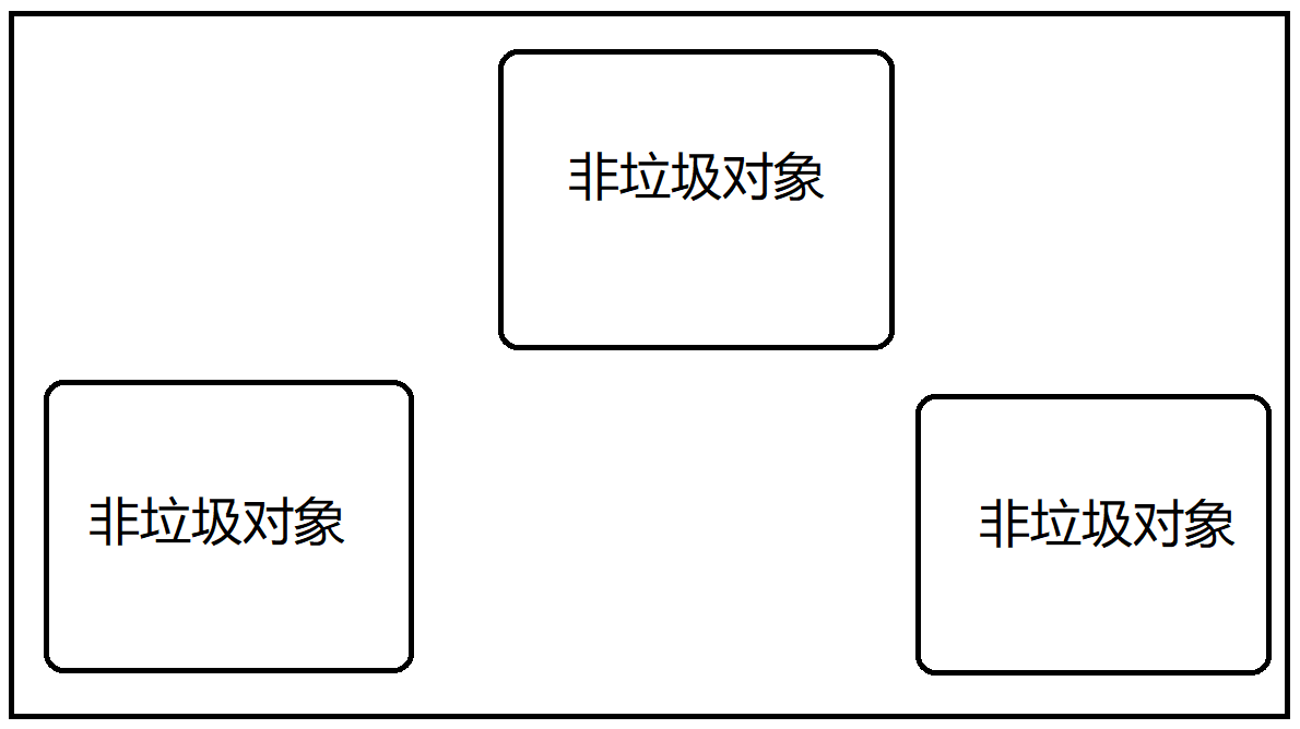 图一中每个垃圾对象都被做了标记,接着jvm就会回收做了标记的对象的内存,回收之后就变成了图二这样的情况,因为标记清理算法并不会进行垃圾回收后的内存整理,这样每个被回收后的内存区域就会散落在整个java堆内存的各个角落,产生很多的内存碎片。这样就非常尴尬了,当我们再在程序中申请一块比较大的内存区域时,因为java堆中空闲区域都是零零散散的小区域,不能找出一块完整的,较大的区域,所以就无法满足这个请求了,于是jvm认为内存不够用了,就又进行一次垃圾回收。。。。所以说标记清理算法有一定的缺点,它只能用在特定的区域中。