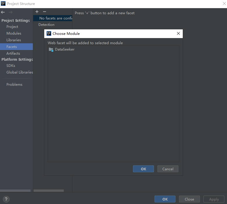 4.选择Facets,点击+号,选择Web,点击项目名,OK