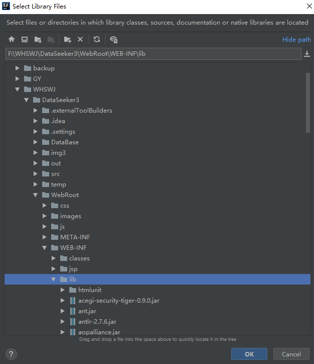 选择项目的lib库,导入jar包,不同项目lib库位置差异,请以实际为准