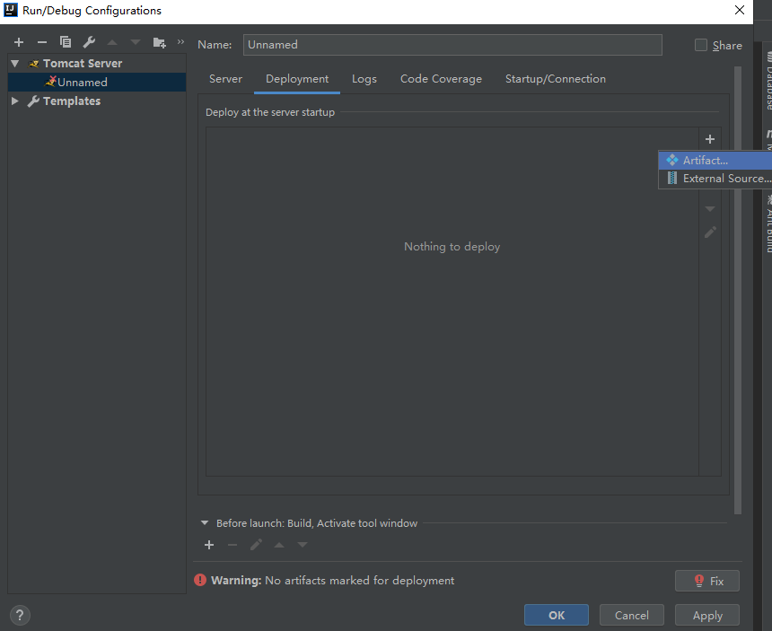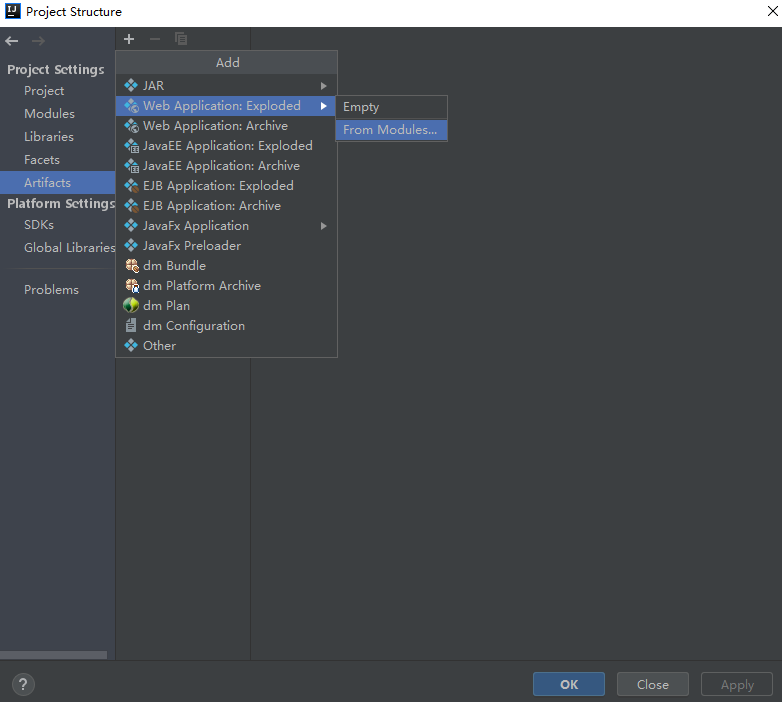 依次点击Deployment > + >Artifact > 选择项目 > Apply > OK
