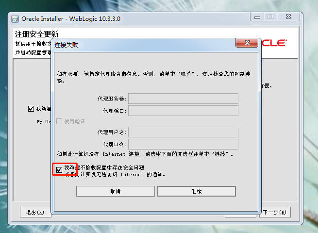然后继续下一步,代理服务器等内容也不用管,不接收配置中的安全问题