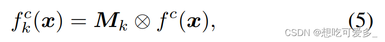 现在根据公式(5),我们把第 k 类的激活图 Mk 和 f 的 C 个通道逐个做对应像素相乘(⊗ 代表pixel-wise的乘法),然后生成 fk。标注中有的每类都要做一次,这样会得到 j 个 fk(f1, f2, f3, ...)。