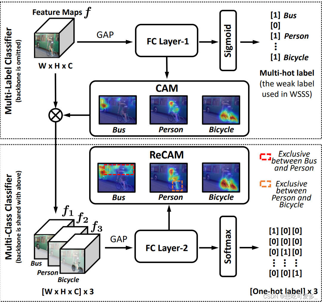 CAMk是第 k 类的激活图,同一张图片对标注中有的每一类都会有生成一张激活图(本文构思的关键:class-exclusive)。