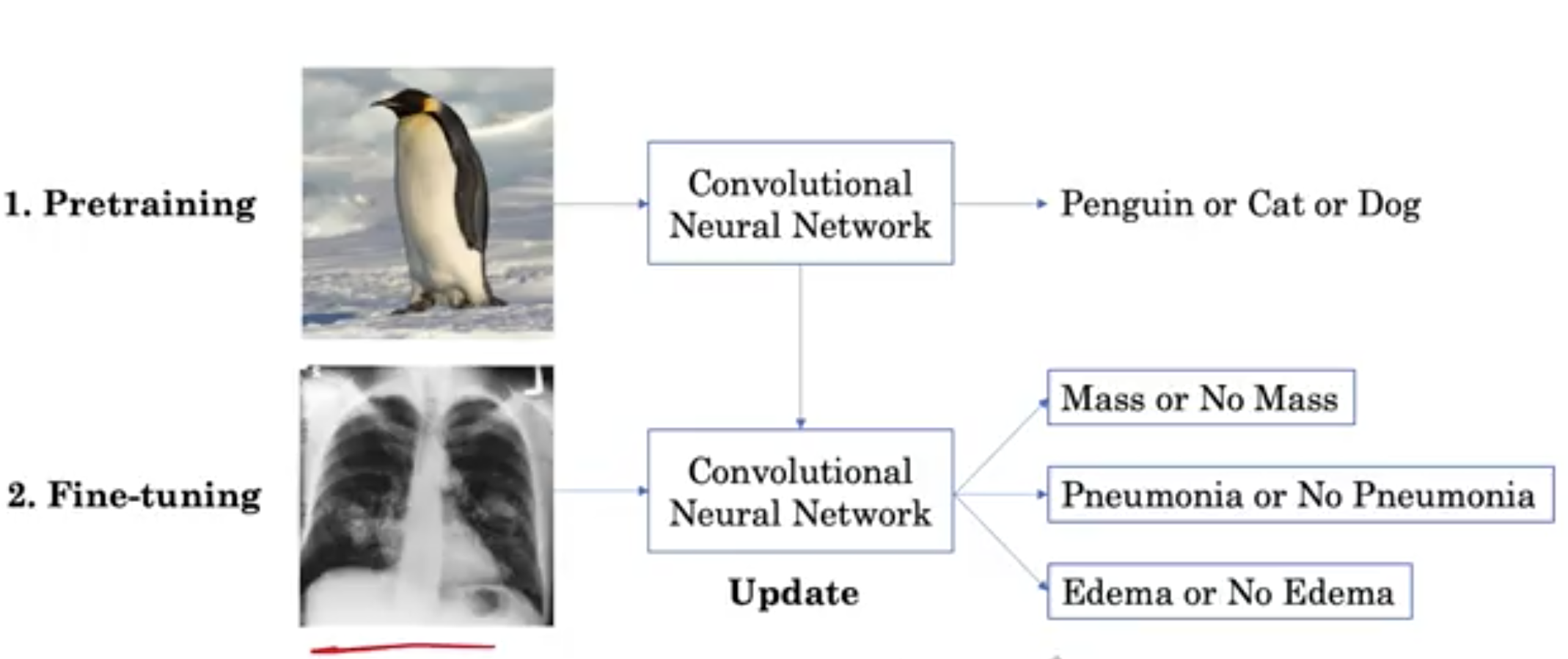 这里的想法是先通过自然图像建立网络,然后学习识别对象,如企鹅、猫或狗,然后将这个网络作为学习的起点,通过复制学习到的特征。然后,该网络可以进一步训练,以查看胸部X光片,并确定是否存在疾病。