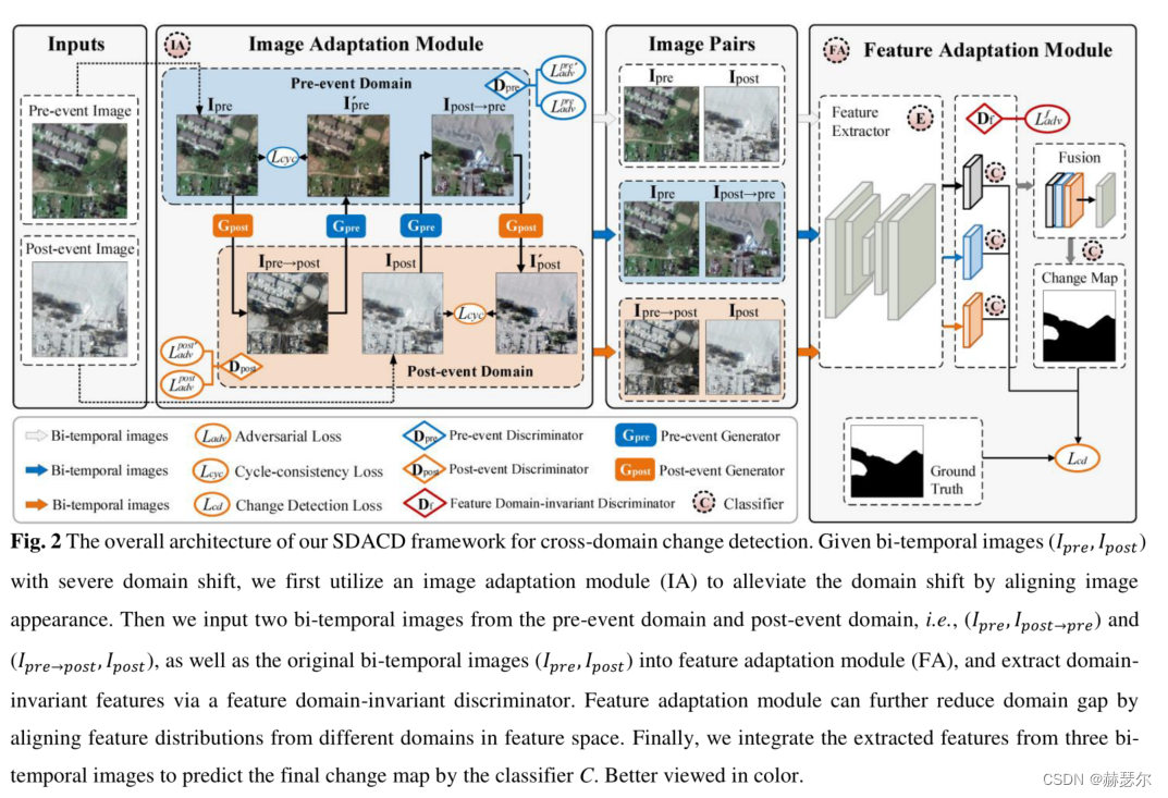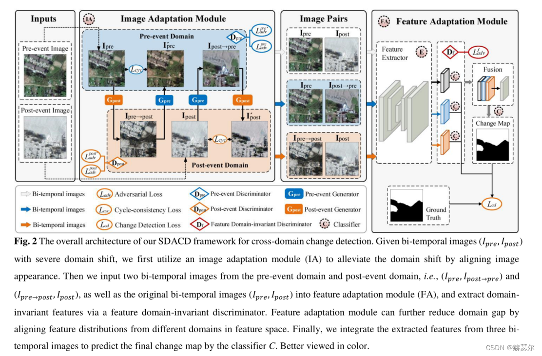 我们提出了一种用于跨域变化检测的新型监督域适应框架 SDACD,它以端到端可训练的方式统一图像适应和特征适应,以减轻事前和事后图像之间的域转移;
