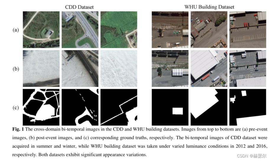 最近,受益于深度学习的快速发展,许多基于深度学习的变化检测方法被提出,并且由于自动高级特征提取的强大能力,它们表现出优于传统方法的性能和鲁棒性。基于深度学习的方法通常首先使用类似于孪生网络的卷积神经网络从双时相图像中提取判别特征,然后利用全卷积网络或基于度量的模块来预测最终的变化结果[13]-[24]。理论上,为了准确预测特征空间的变化结果,从双时相图像中提取的特征应满足以下约束条件:与变化像素对相关联的特征向量彼此相距较远,而不变像素对则较近。然而,这个假设在现实中很难满足。由于双时相图像通常是在不同时间获取的,其成像传感器、大气和亮度条件会有所不同,这不可避免地导致双时相图像无论地理元素是否发生变化都会出现完全不同的外观。如图1所示,季节和气候带来的时变变化比人为因素引起的真实变化更明显,例如建筑物和道路的建造或破坏。这些伪变化使得现有的基于深度学习的方法难以从双时态图像中提取满足上述约束的特征,这些方法通常侧重于设计具有强大特征表示的复杂神经网络,而忽略双时态图像之间的域偏移。图片。