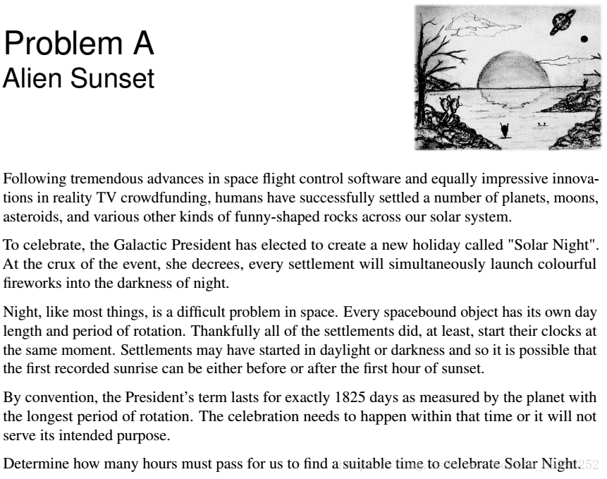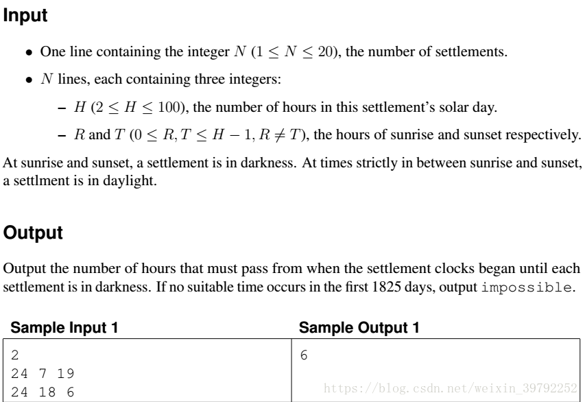 题意:题目很简单,就是说现在想找一个最早的时间,所有星球都在晚上,现在已经知道各个星球的自转周期,并且知道他们各自日出日落时间。。。