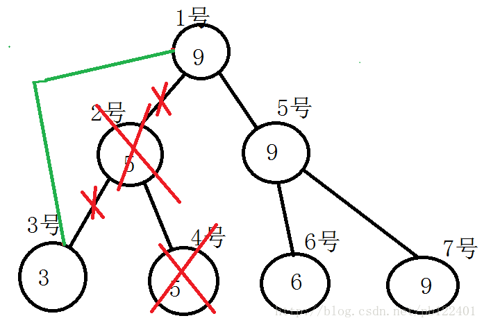 4、删除后2号节点只有左儿子,没有右儿子,因此该节点没有意义,用3号节点将其代替