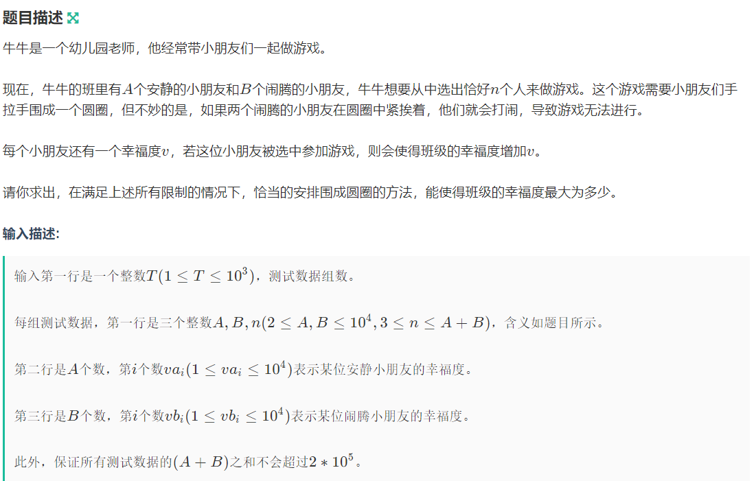 我最开始思路是用sort函数将a数组(即安静的小孩)与b数组(淘气的小孩子)的幸福值按从大到小排序【不会还有人用冒泡排序吧,赶紧去学一下c++的sort函数】。