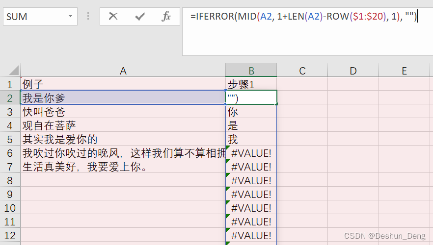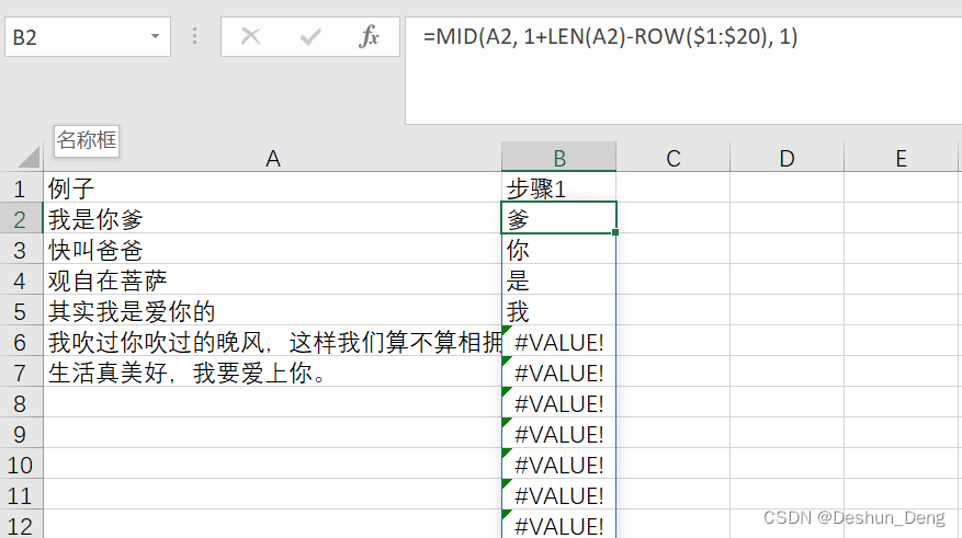 1、将文本从后往前逐个拆分【根据文本长度,生成逆序列,然后用Mid函数逐一取出文本中的字】;