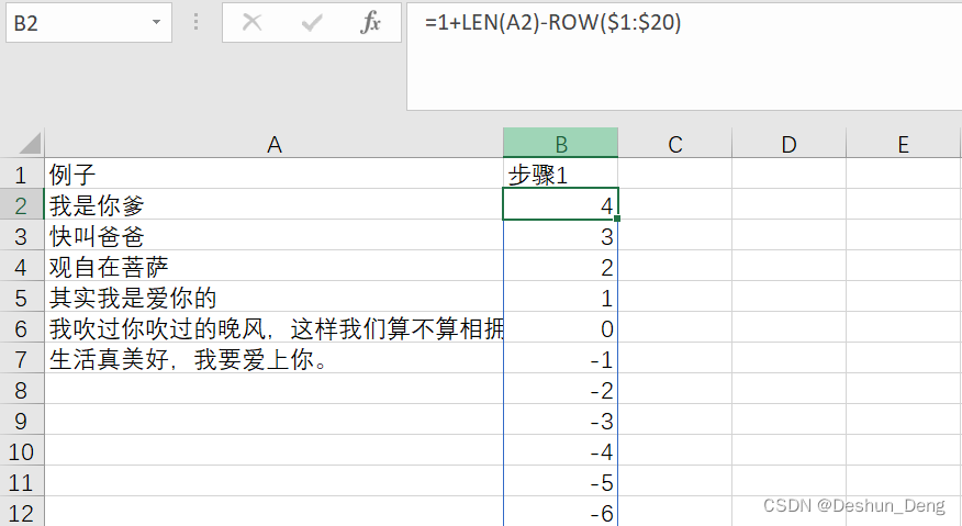 1、根据单元格内文本长度生成逆序数,