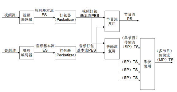 - 将基本流打包成基本流数据包,并实现音视频的基本流数据包复用,组成复用的传送流