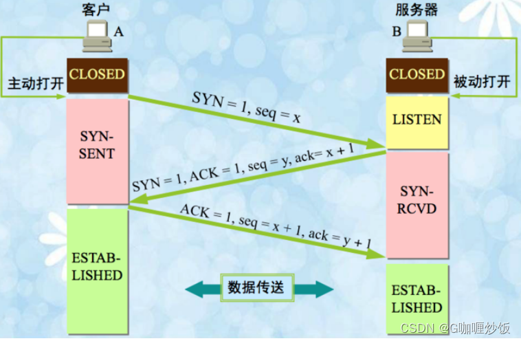 1.由客户端发送建立TCP连接的请求报文,其中报文中包含seq序列号,是由发送端随机生成的,并且将报文中的SYN字段置为1,表示需要建立TCP连接。(SYN=1,seq=x,x为随机生成的序列号)此时客户端处于 SYN-SENT状态