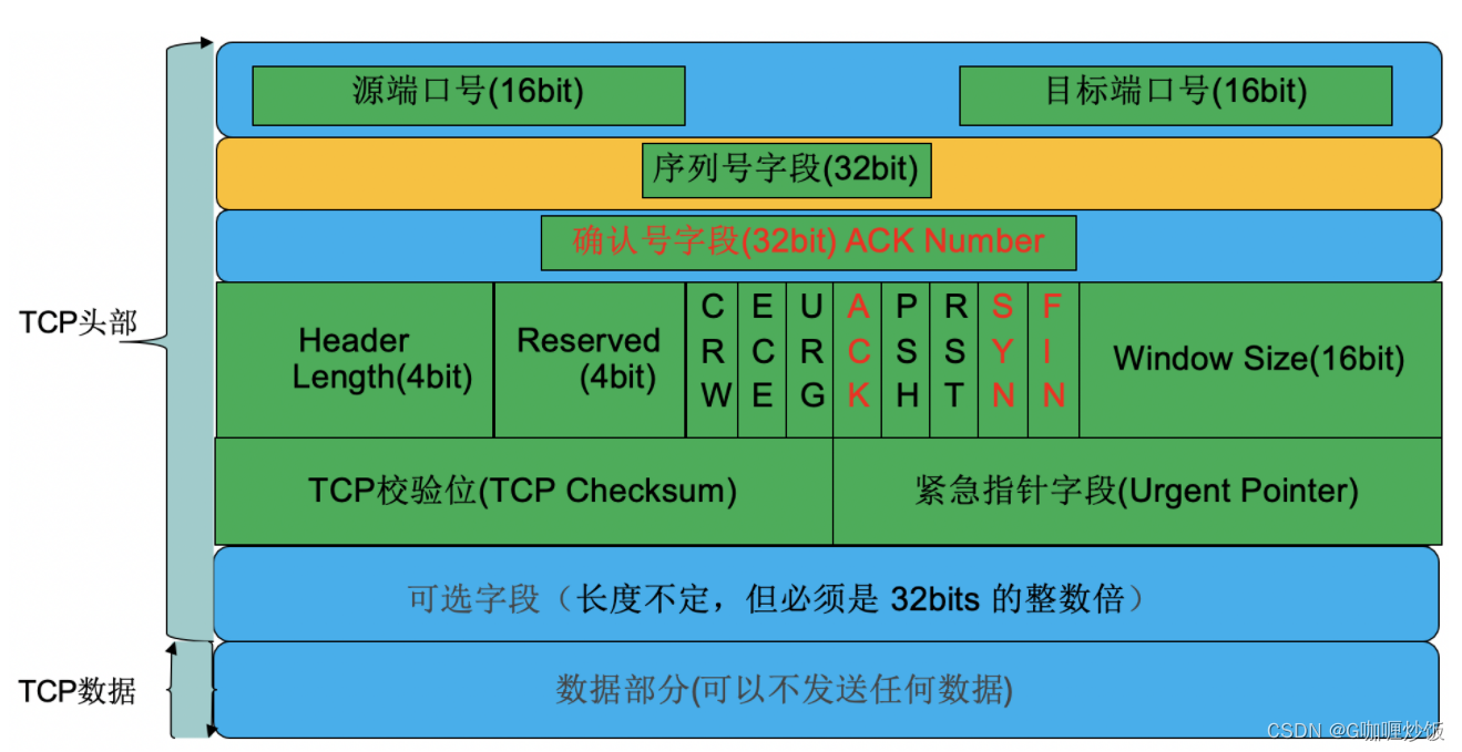 ACK:确认位。只有当ACK=1时,确认序列号字段才有效:当ACK=0时,确认号字段无效。