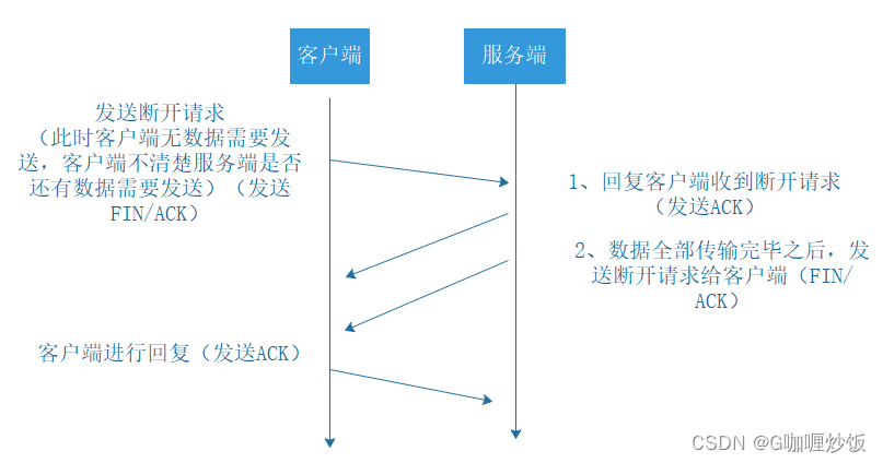 而客户端发出FIN报文时只能保证客户端没有数据发了,服务端还有没有数据发客户端是不知道的。而服务端收到客户端的FIN报文后只能先回复客户端一个确认报文来告诉客户端我服务端已经收到你的FIN报文了,但我服务端还有一些数据没发完,等这些数据发完了服务端才能给客户端发FIN报文