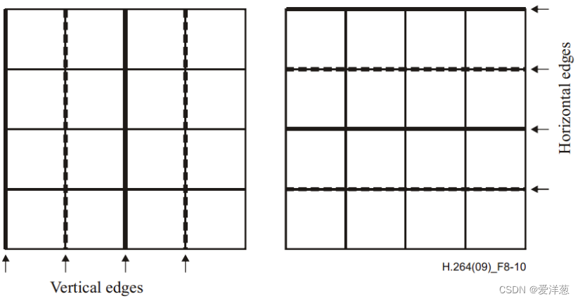 上图整体表示一个16x16的宏块,每个小框表示的是子块,左边表示垂直方向的边沿,右边表示水平方向的边沿,实线表示半宏块的边沿,虚线表示1/4宏块的边沿。