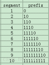 后缀表示的是段内信息,即相对于段的起始位置的偏移量,可以看到,只有segment 5, 6, 7, 8, 9, 10才需要后缀表示。segment 5, 6需要1个bit表示偏移; segment 7, 8需要2个bit表示偏移;segment 9, 10则需要3个bit表示偏移。