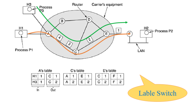 如图,H1向H2发送数据时,会在发送之前协商一条路径,中间的路由器会记载下这条路径并给这条路径标号。当H1封装时,只需携带路径标号,路由器会根据标号找到路径,最终到达H2。当H3向H2发送数据时,协商的路径可能和H1到H2的路径重合,但是路径编号不同。