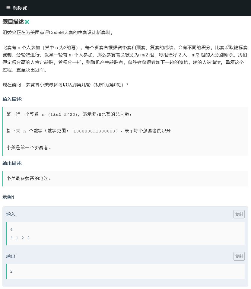 我的想法是将选手成绩存放到名为a的vector中,将1到n个升序排序(0是第一个序号,第一个是主人公的分数不用排序),然后两两比较,低分就erase掉,注意之一端是i++而不是i+=2: