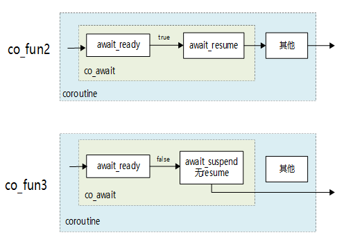 上例中,编写了一个满足awaitabble接口的await_op结构,由await_ transform返回,这是构造co_await expr的一种方法(另外一种见下例)。主要由于co_await的输入不同,await_ready的返回也不同,co_fun2, co_fun3的执行顺序如下图所示。
