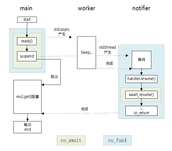 上面的输出有点“混乱”,其实上面程序中产生了3个线程,一个主线程main,一个由std::async产生的工作线程(称为worker),一个在await_suspend中产生的等待-通知线程(称为notifier)。运行示意如下图所示。
