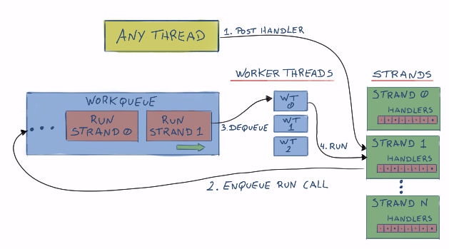 蓝色的WT是工作线程,工作线程从io_context的事件循环中获取Executor,并执行。如果工作队列中的Executor是在Strand中,那么strand可以保证在strand中的任务,不会被多个线程并发的执行,即这些任务在时间上是串行化的。