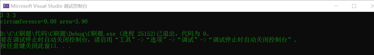 printf("circumference=%.2f area=%.2fn", circumference, area);