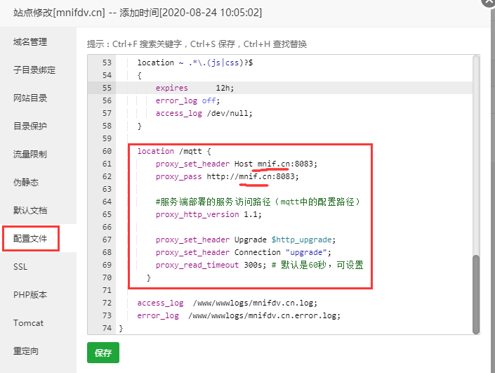 当然也不能全部的转,咱呢把url里面凡是访问 /mqtt 这个路径的转到MQTT服务器上去.