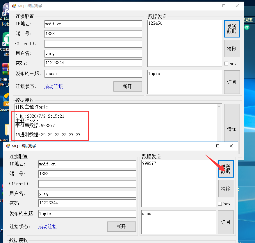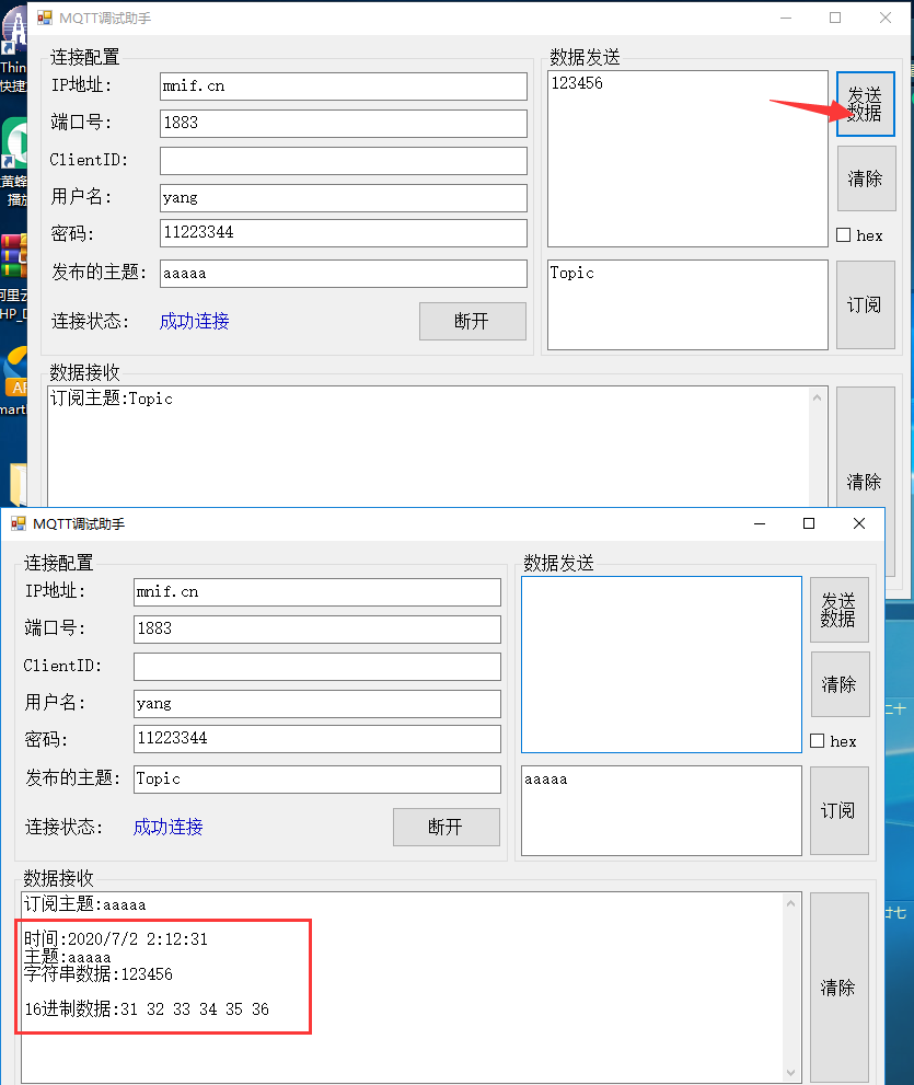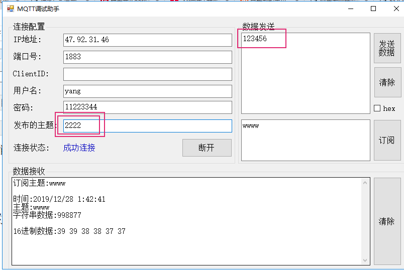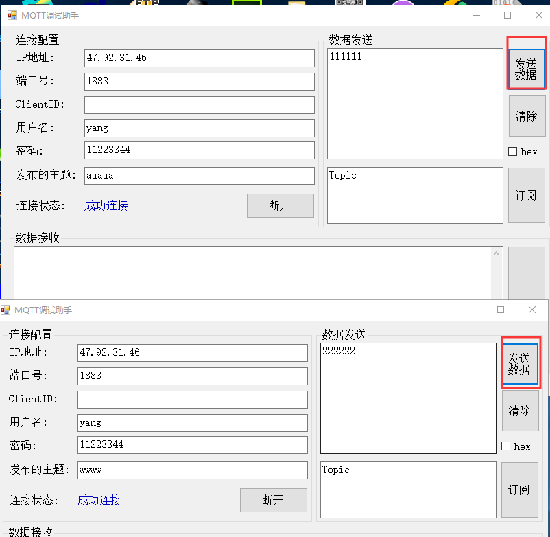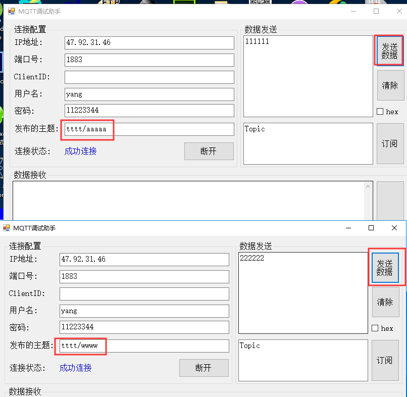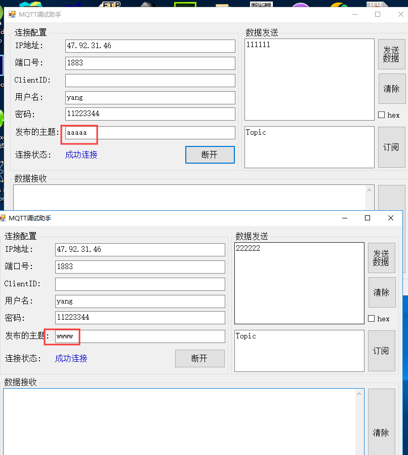 第一个客户端发布的主题那一栏填写的是 aaaaa 然后发送的消息是 123456