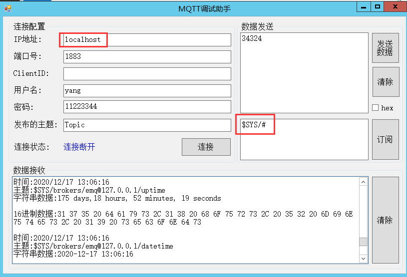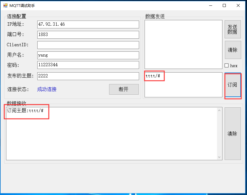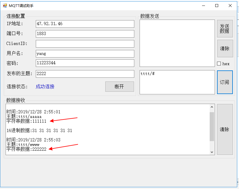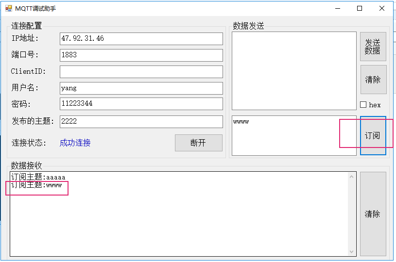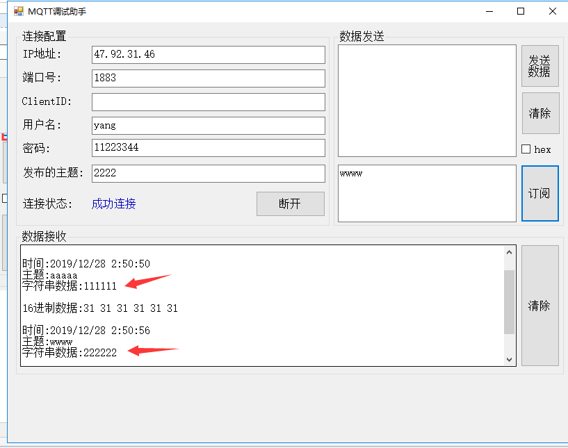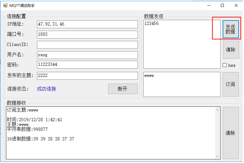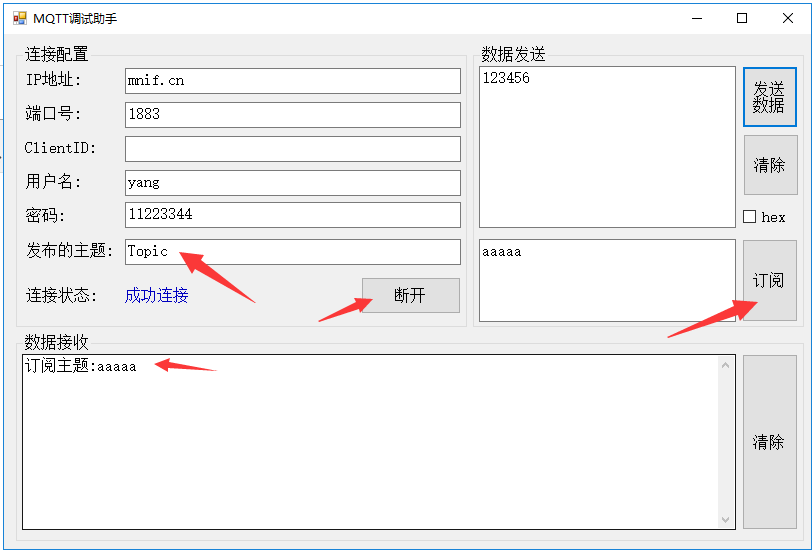 第一个客户端发布的主题那一栏填写的是 aaaaa 然后发送的消息是 123456