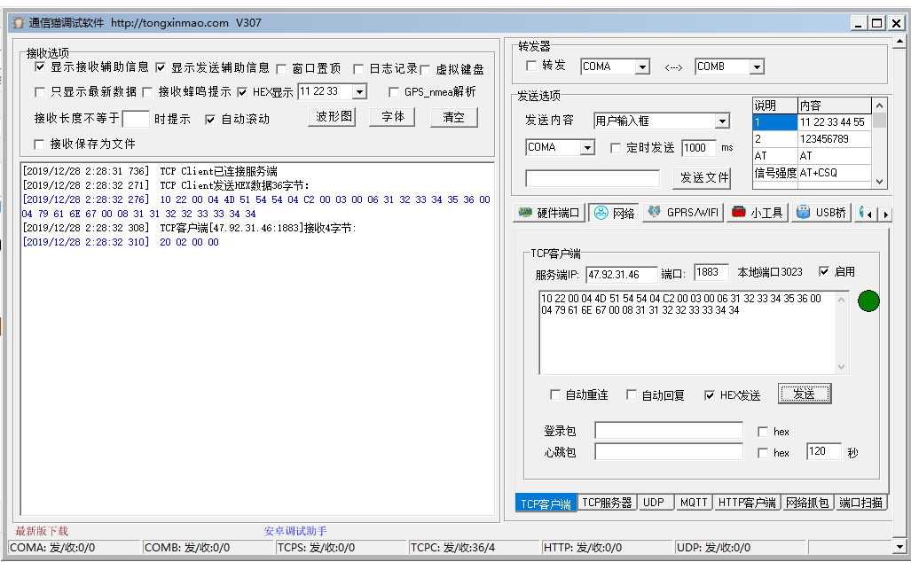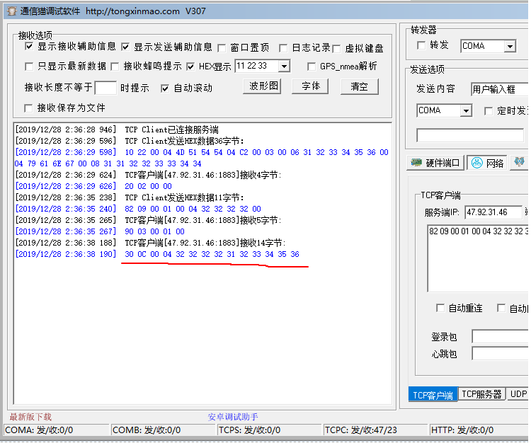 然后设备1连接上TCP服务器以后呢,这样发送信息(假设发送的消息是123456): aaaaa123456