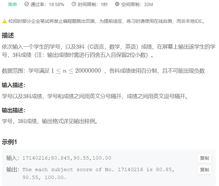 这个题是上一题的升级,除了要进行输入,还要注意题目中所说的输出成绩时需要进行四舍五入并且保留两位小数