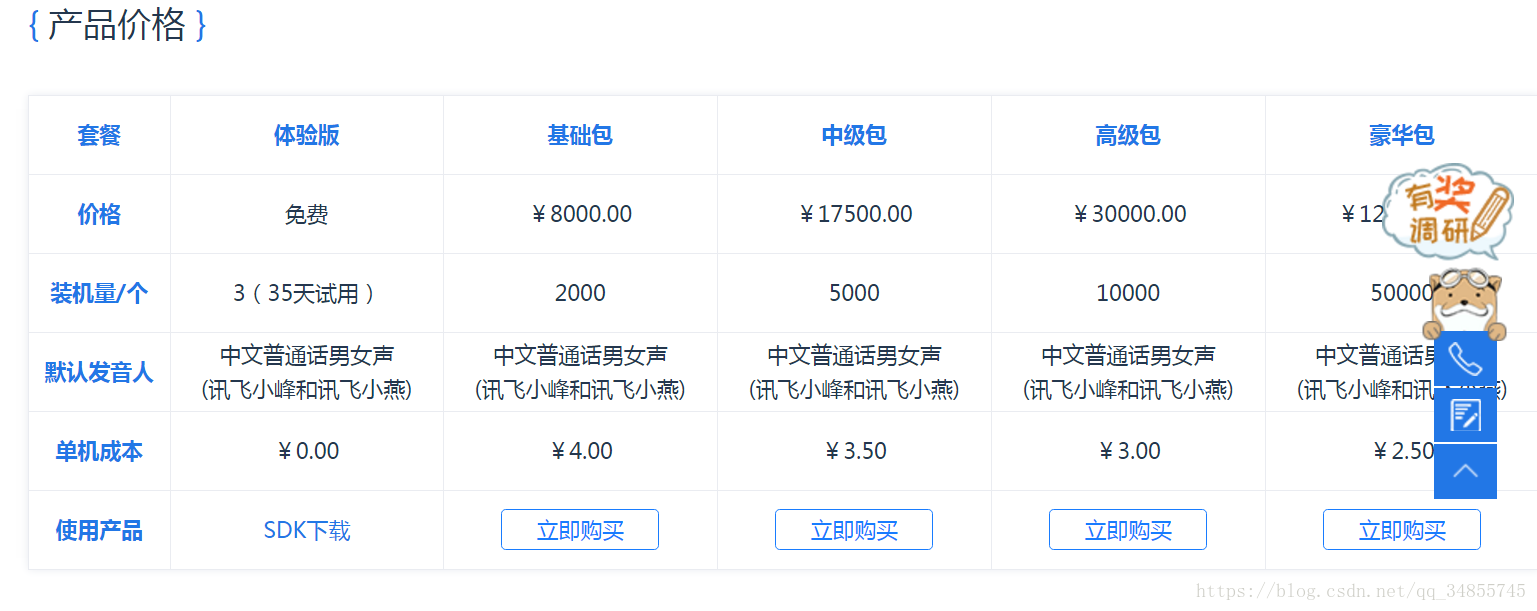 讯飞语语音合成有在线和离线两种,在线免费,离线收费,收费标准如下: