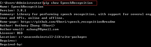 然后使用命令pip show SpeechRecognition查看是否安装成功,如下图: