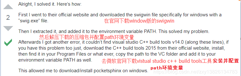 网上介绍安装CMUSphinx基本上都是基于Linux系统的,基于Window系统的是有,但是比较复杂,还要自己使用Vistudal Studio这个庞大的编辑器进行编译,并且还是基于c++开发的,基于window+python安装的我看到有一篇博文https://blog.csdn.net/weixin_40490238/article/details/84841825有介绍,但是我按照他的步骤没有成功,在安装PocketSphinx模块库时出现错误