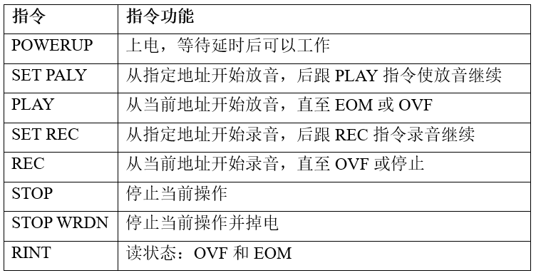 程序设计包括两个程序:录音程序以及放音程序。语音芯片WT588D在器件延时后才可以开始操作。所以,当用户发送上电指令后,必须等待延时才能发出一条操作指令。部分指令如表所示: