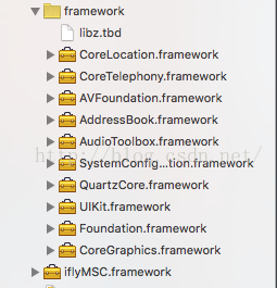 下面我们来创建一个工程,将lib文件夹下的“iflyMSC.framework”拷贝到工程目录,然后在工程中添加依赖库,如下图所示: