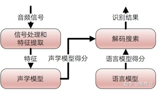 将语音片段输入转化为文本输出的过程就是语音识别。一个完整的语音识别系统通常包括信息处理和特征提取、声学模型、语言模型和解码搜索四个模块。语言识别系统如下图所示: