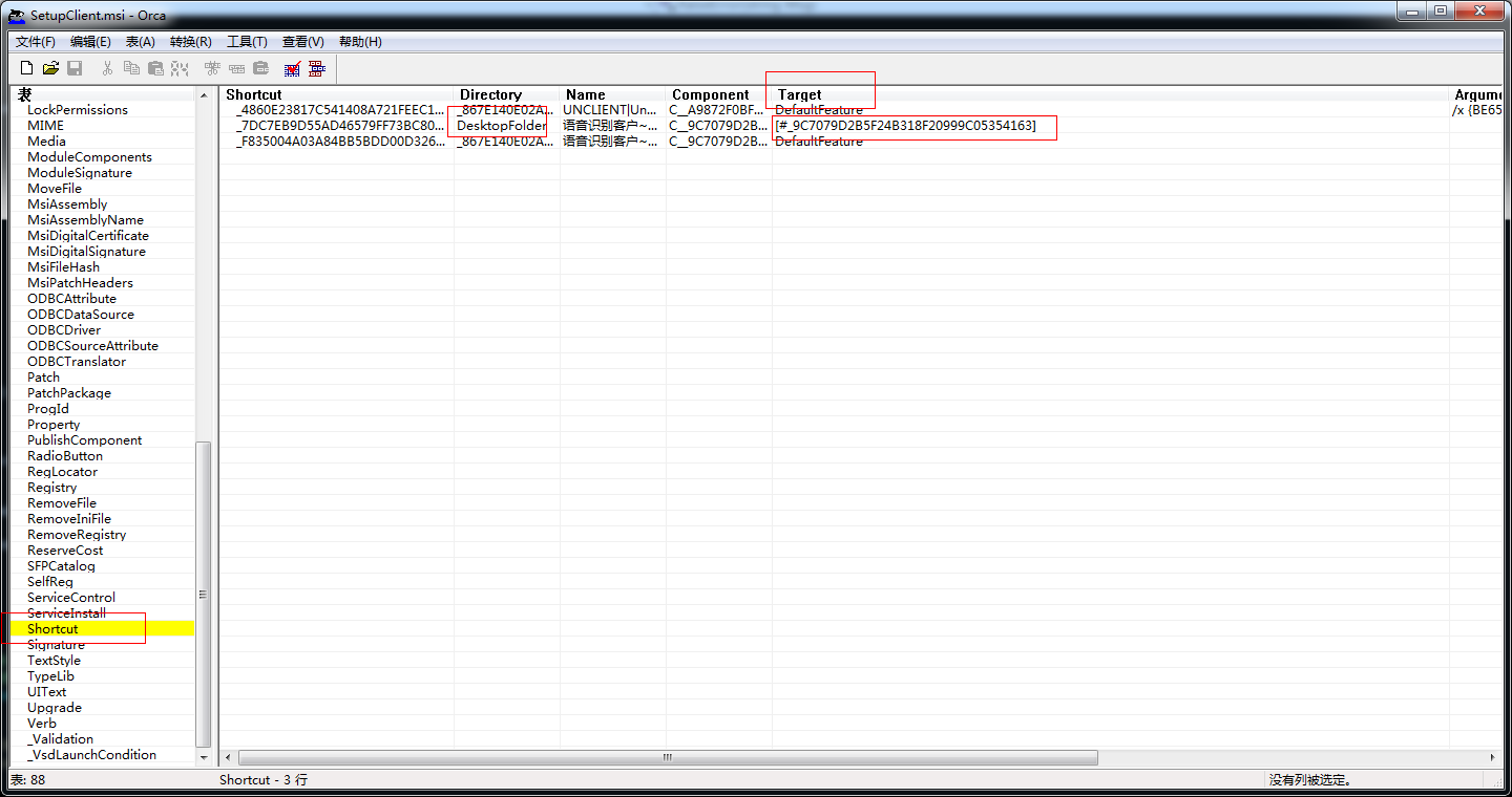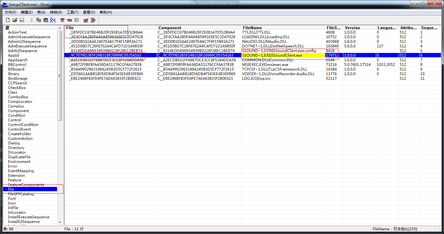 第二:用orca打开XXX.msi安装包,找到左列里面的打开“File”:然后在右侧里面找到你对应的应用程序所在行,我这里是:(SSOUND~1.EXE|SSoundClient.exe)。