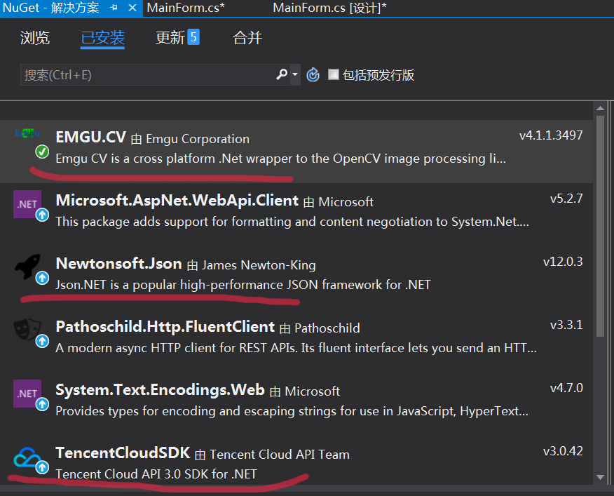 打开vs2015 , 新建一个C# winform项目, , vs菜单:工具->Nuget 管理器->管理解决方案的NuGet程序包, 安装TencentCloudSDK v3.0.42, emgu.cv, newtonjson等