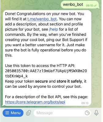 使用最先创造账户时的acess token来进行监听,所有发往这个机器人账户的消息都将会显示在command window里.
